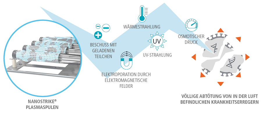 Novaerus-Geräte nutzen mittels NanoStrike-Technologie mehrere physikalische Verfahren gleichzeitig zur Inaktivierung von Krankheitserregern. Die NanoStrike-Spulen geben einen kraftvollen Impuls ab, der in der Luft befindliche Erregerzellen zum Platzen bringt und sie schnell inaktiviert.