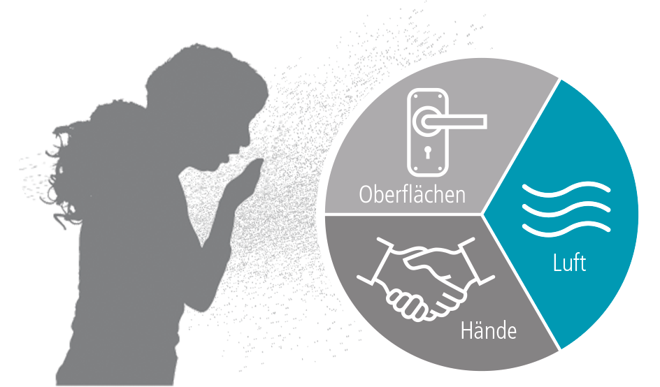 Überall dort, wo Menschen zusammenkommen, werden Keime in Innenräume eingeschleppt. Wenn Krankheitserreger in die Luft geraten, legen kleinere Partikel mithilfe von Luftströmen durchaus große Entfernungen zurück. Größere Partikel setzen sich schnell auf Oberflächen ab, von wo sie durch Handkontakt weitergetragen werden können.