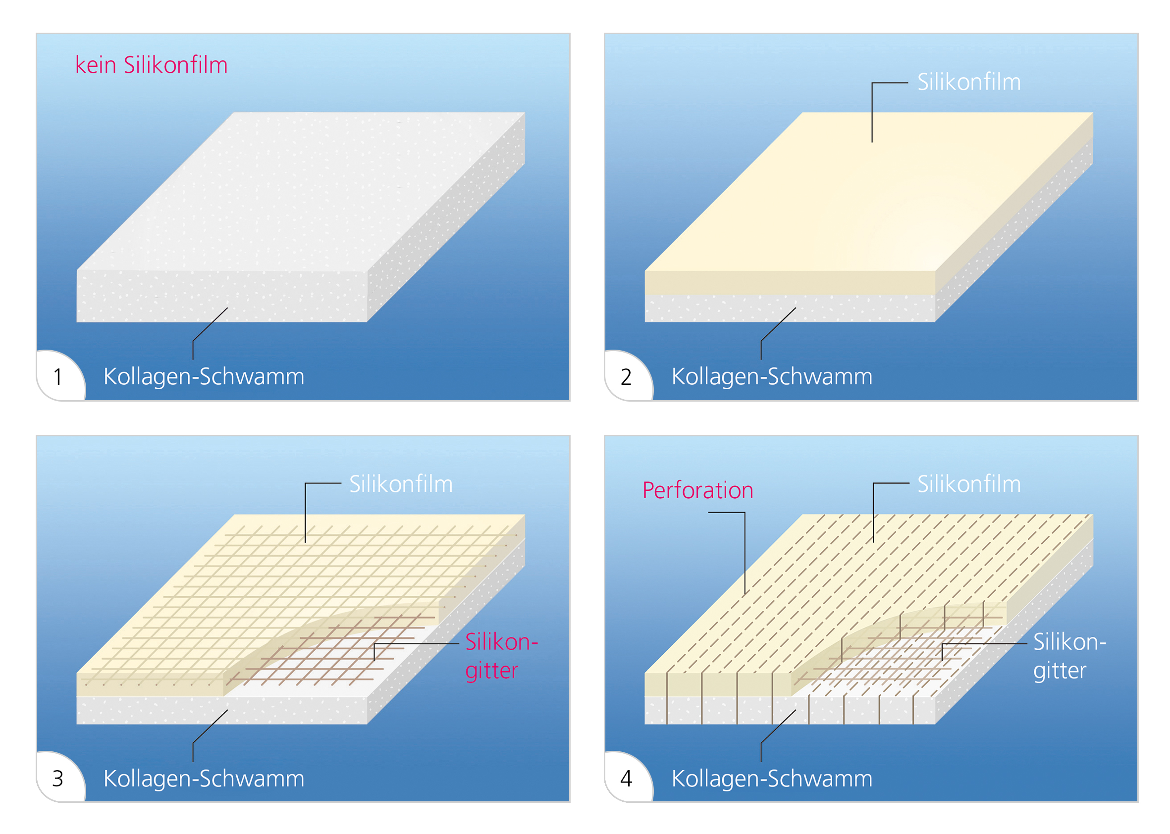 Standard: Wird aus zwei Lagen gefertigt – der Atelokollagen-Schwammschicht und der Silikonschicht. Dieses Produkt wird erfolgreich bei der Versorgung chronischer Wunden wie z. B. Ulcus cruris venosum, Ulcus cruris arteriosum oder dem diabetischen Fußsyndrom verwendet.